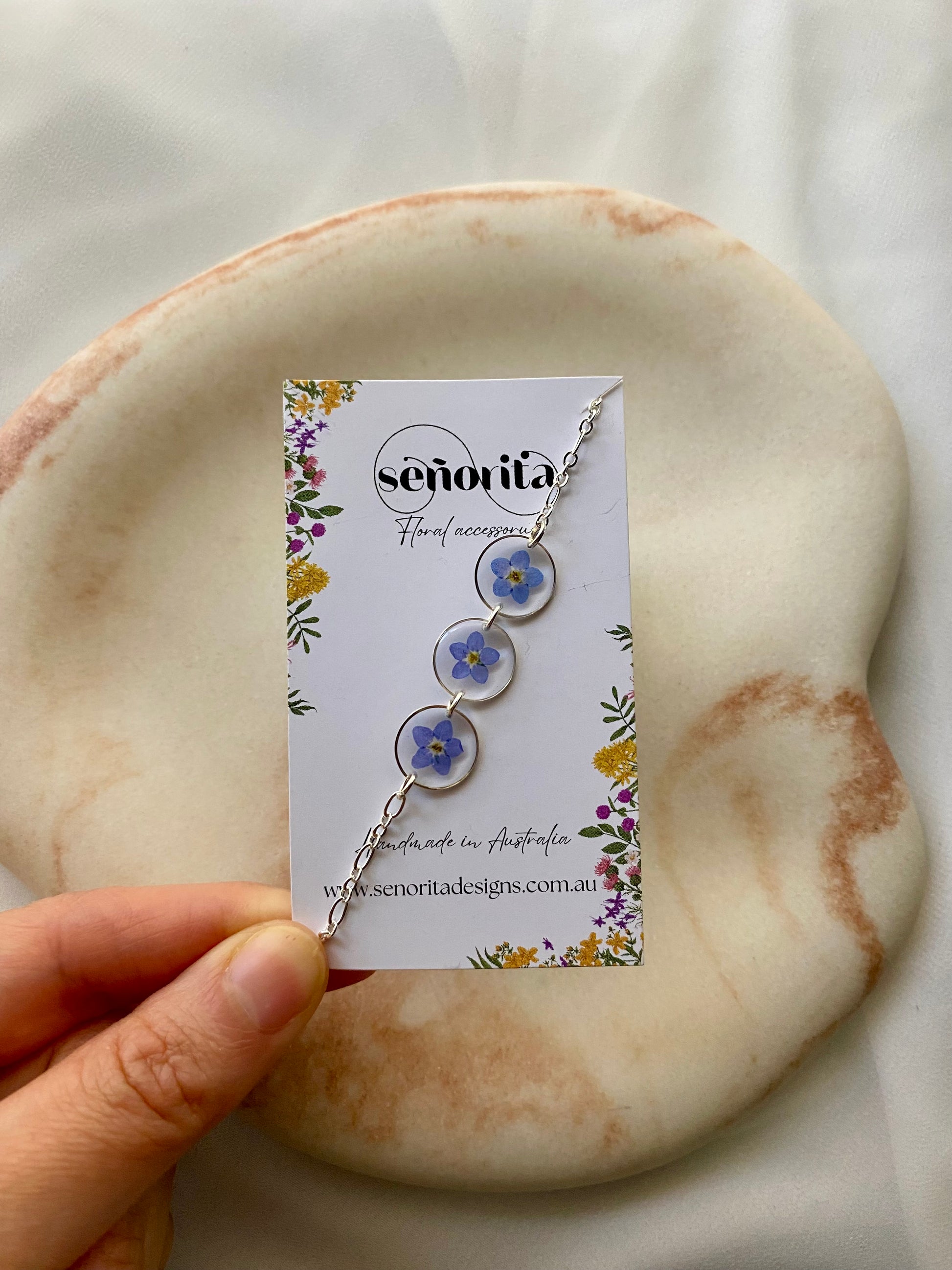Forget me not flowers preserved in resin.