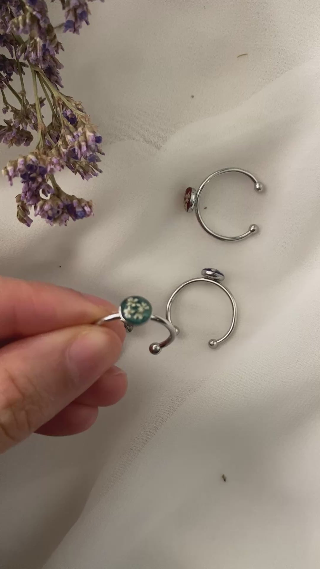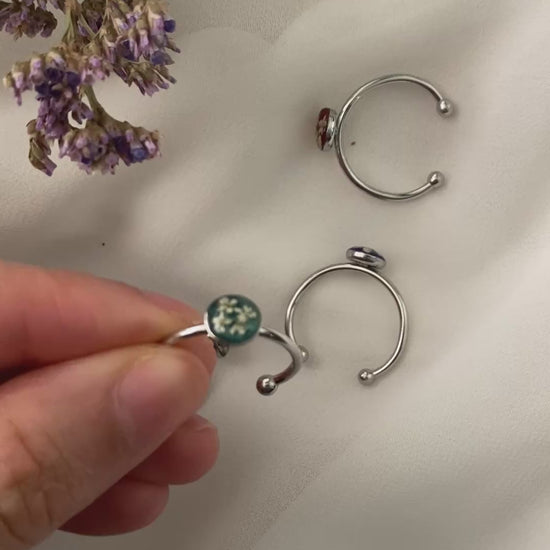 Stainless steel adjustable ring with real dried Queen Anne’s lace flower.