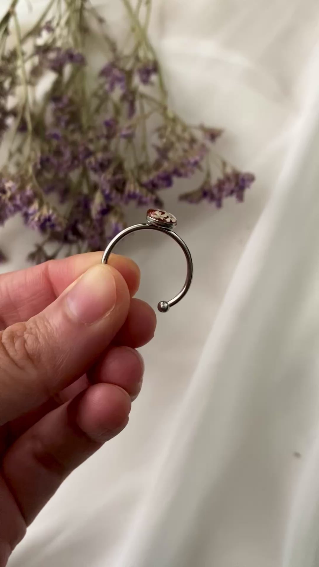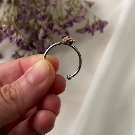 Stainless steel adjustable ring with real dried Queen Anne’s lace flower.